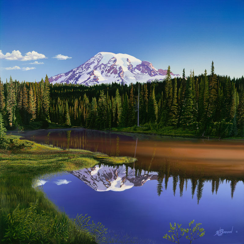 Mount Rainier National Park "A Majestic Slumber” a scenic landscape depicting the tranquil calm of Mowich reflective Lakes mirrored by Mt. Rainier an active volcano and glaciated peak, appearing like a majestic slumber in Mount Rainier National Park. Original painting by artist Kurt Burmann ©