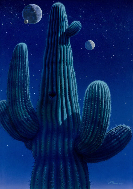 Desert Dreams” Illuminated by the twilight beneath surreal celestial skies, a colossal Saguaro cactus stands majestically paramount like a sentinel amidst the tranquility of the Sonoran terrain. Revealing to the imagination and spirit a mystical vision of a desert dream. Original painting by artist Kurt Burmann ©