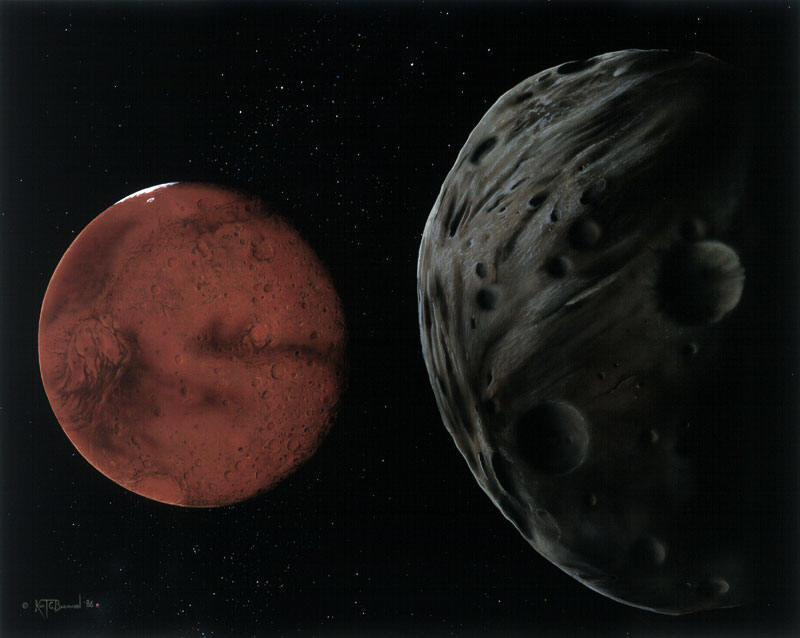 " "Dread of War" Approaching the orbital view of Deimos, Mars smallest of two moons some 23,459 KM distance from the surface of Mars. This close encounter reveals detailed features of Deimos subdued surface. While capturing a harvest view of the mother planet we reach a distant glimpse of the Margaritifer Sinus Region. Original painting by artist Kurt Burmann ©