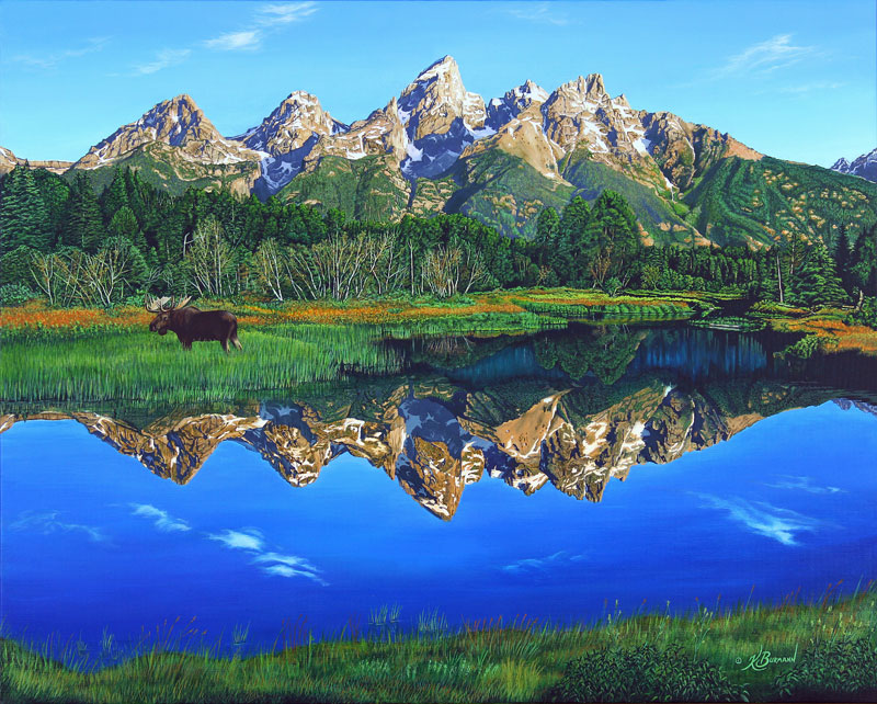 "Grand Teton Mirror of Serenity” a scenic landscape of a lone moose ambling in the morning serenity as the silent still waters, reflects like a mirror the magnificent range of the Grand Tetons near Schwabacher landing in Grand Teton National Park. Original painting by artist Kurt Burmann ©