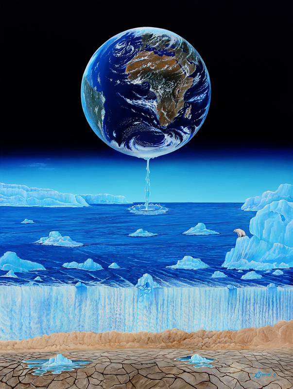 “Meltdown” Reveals the revelation of natural disasters happening worldwide, floods, droughts, forest fires, and extreme weather conditions to our planet which is under siege from Climate Change. We perceive the continuation of glacier-melt happening in Polar Regions and beyond, ultimately triggering catastrophic effects or “Meltdown” on our planet. Original painting by artist Kurt Burmann © Polar Bear - Detail ![]()