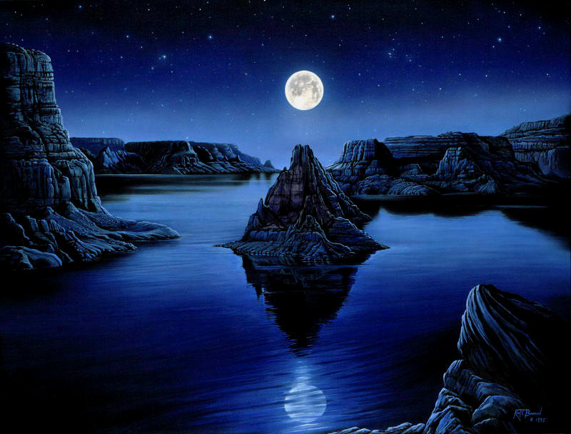 Lake Powell Glen Canyon Recreation Area Moon Spirit” a scenic landscape portraying a full moon rising in the night sky above the otherworldly like terrain of Lake Powell in Glen Canyon National Recreation Area. Reflecting in the still waters like a mysterious moon spirit. Original painting by artist Kurt Burmann ©