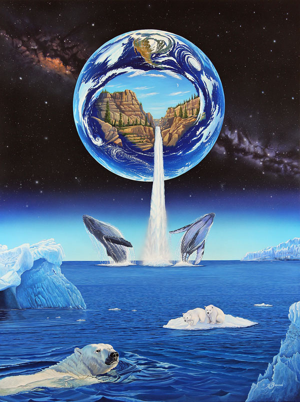 "Peril In Paradise" Portrays Global Warming and Climate Change awareness. From our planets canyons, lakes and streams, to our oceans and glaciers. The life and inhabitants of these precious environments are being threaten and endangered to survive. This painting brings to the forefront the urgency to address Global warming, and the immediate concern of Climate Change for the future well-being of our planet and it's inhabitants. Original painting by artist Kurt Burmann ©